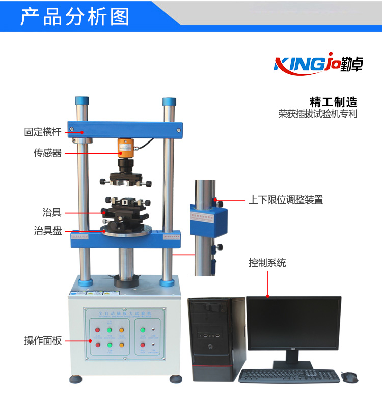 测定承受荷重:50kg 20kg 5kg 2kg分解能力:大于等于0.01kg测定高度:150mm内测试速度范围:0~300mm/min测试次数:0-999999次X、Y轴移动范围:0~75mm传动机构:滚珠螺杆外观尺寸:360*260*940mm重量:67kg(机台)电源:AC110V 或 220V测试项目:连接器单孔插拔试验,连接器整排插拔试验,连接器单PIN与塑胶保持力试验,一般压缩、拉伸破
