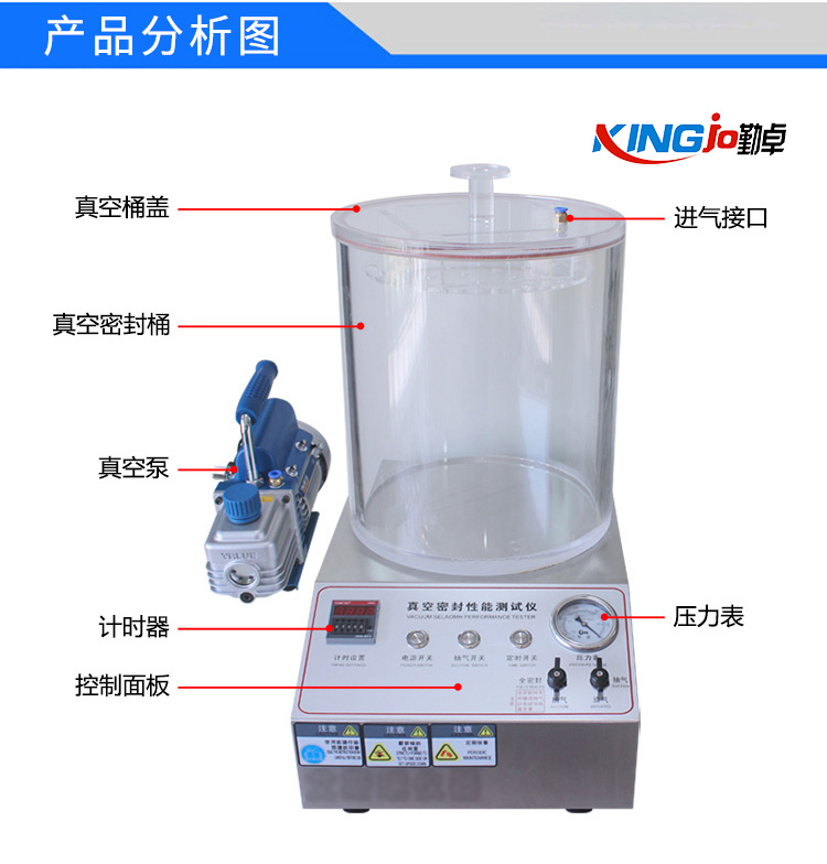 数显真空密封性能测试仪用途和指标 产品用途:适用于食品、制药、医疗器械、日化、汽车、电子元器件、文具等行业的包装袋、瓶、管、罐、盒等的密封试验。亦可进行经跌落、耐压试验后的试件的密封性能测试 测试原理:通过对真空室抽真空,使浸在水中的试样产生内外压差,观测试样内气体外逸情况,以此判定试样的密封性能;通过对真空室抽真空,使试样产生内外压差,观测试样膨胀及释放真空后试样形状恢复情况,以此判定试样的密封